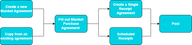 The user can either create a single Receipt Agreement from the Blanket Purchase Agreement or create scheduled receipts. The user is able to post Receipt Agreements without the blanket agreement becoming closed. The final step is to post the Blanket Purchase Agreement.