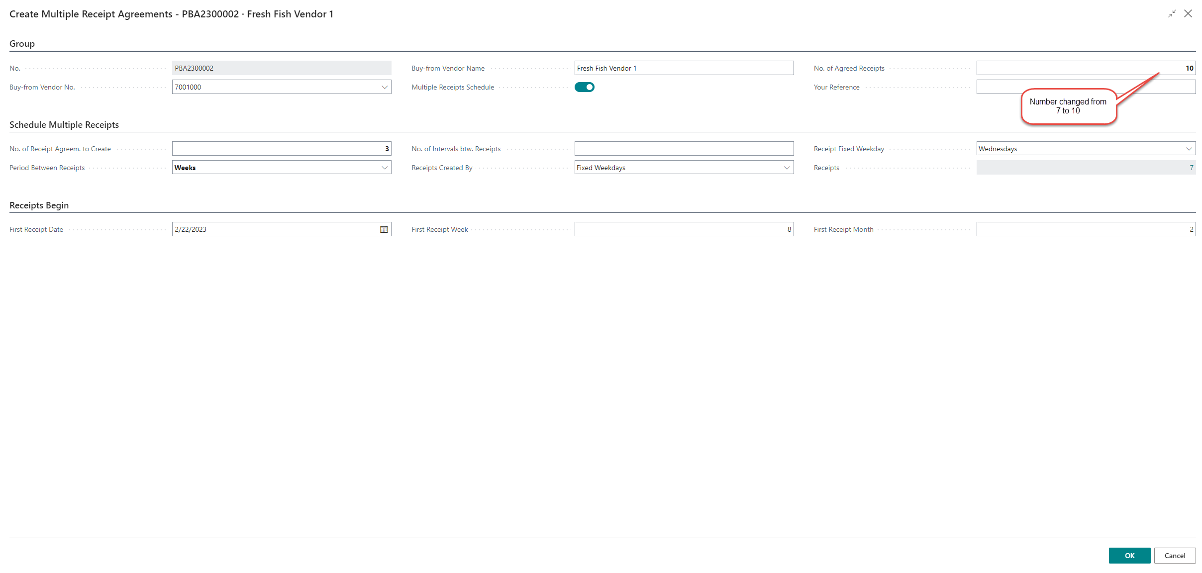 The Create Multiple Receipt Agreements page then opens. In the field No. of Agreed Receipts the number of additional agreements is added – e.g., if 7 agreements were released and 3 others are to be added, then the value is changed from 7 to 10. Click OK create multiple receipt agreements.