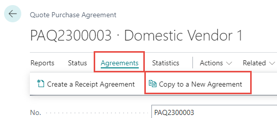 Copy the quote purchase agreement to a new agreement. Click Agreements > Copy to a New Agreement.