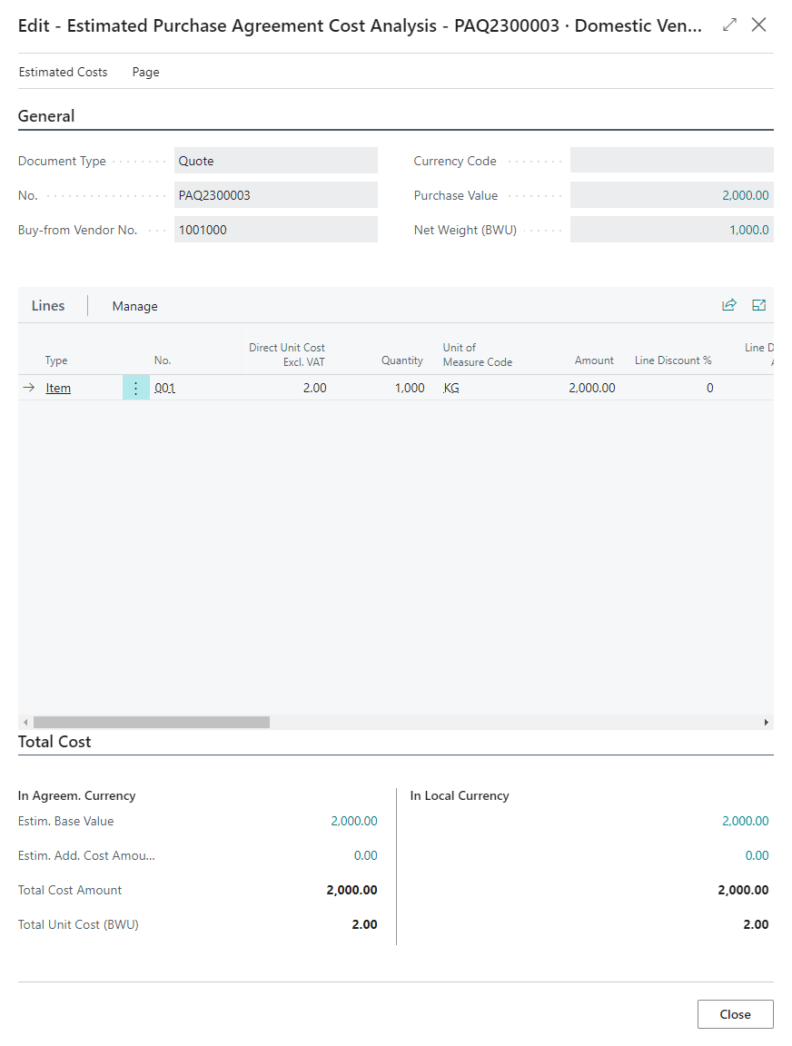 | Total unit cost in the base weight unit of the system (kg/lb). Calculated in total for all lines of an agreement = (´Estimated base unit price (BWU)´ + ´Estimated Additional Unit Cost (BWU)´) / Net Weight (BWU). |