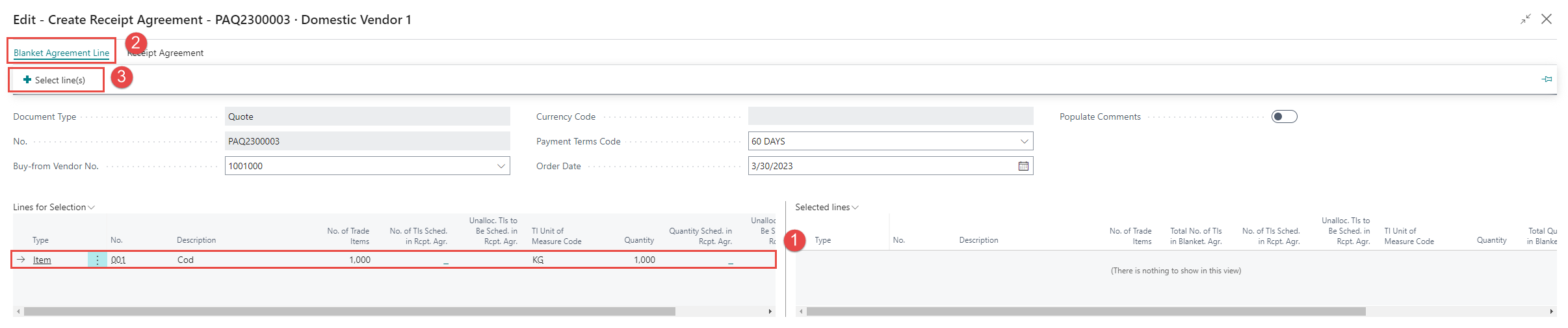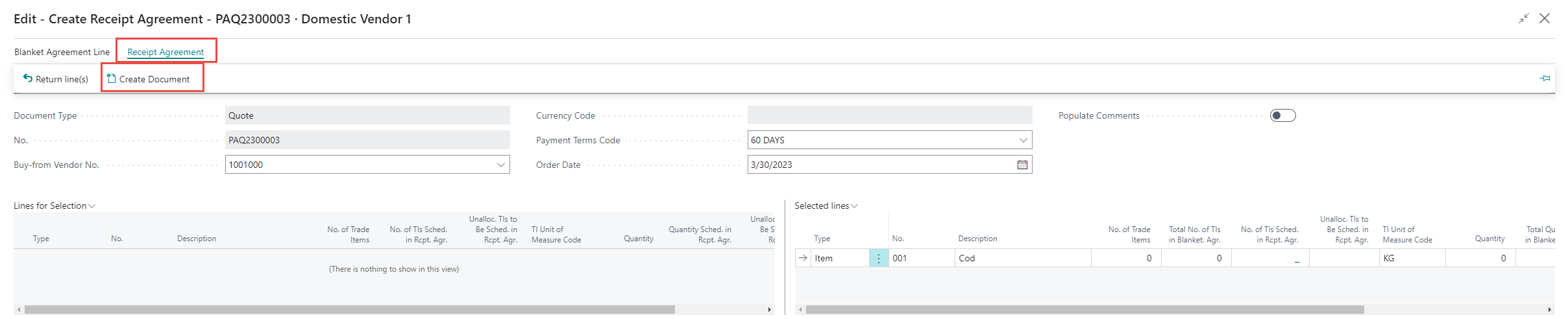 Create a Receipt Agr. from the Quote Agreement