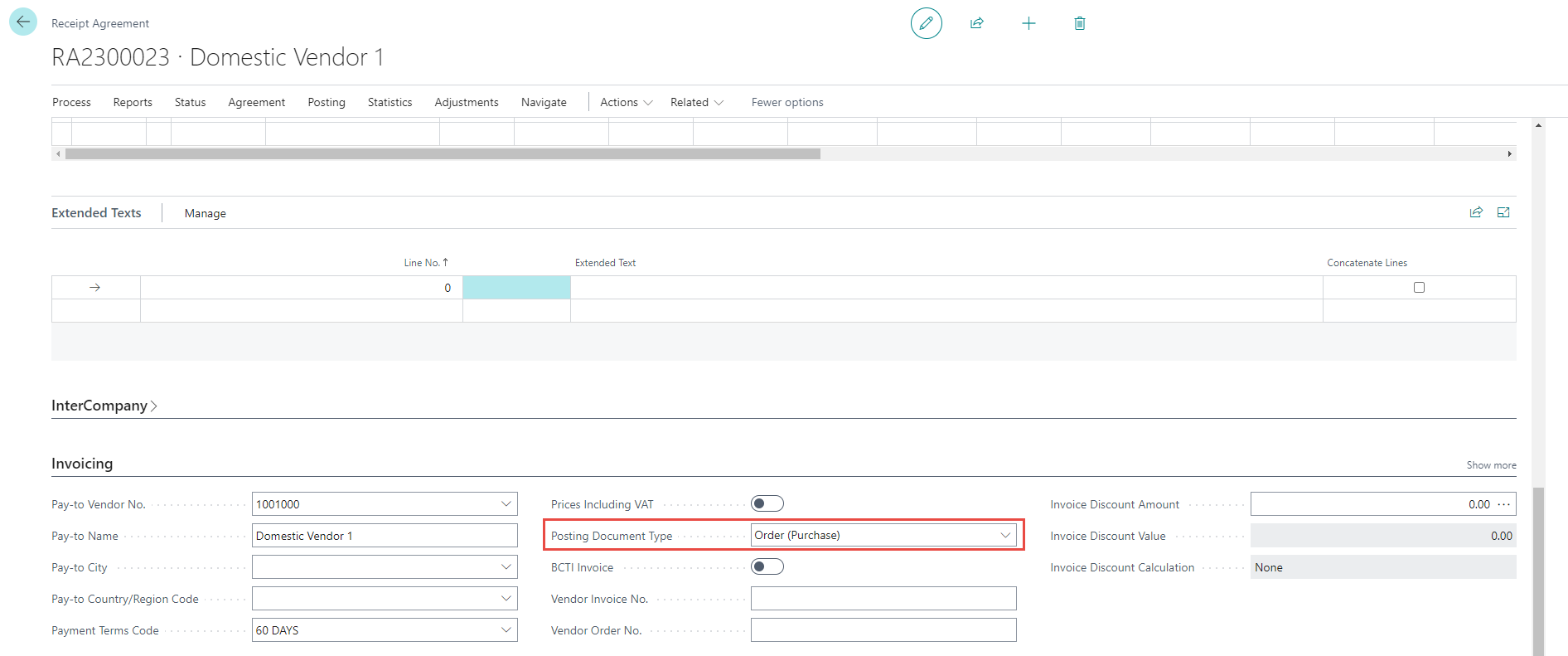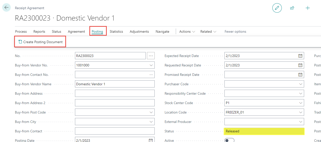 Click Posting > Create Posting Document to create a purchase document. Notice that the Receipt Agreement has to be released.