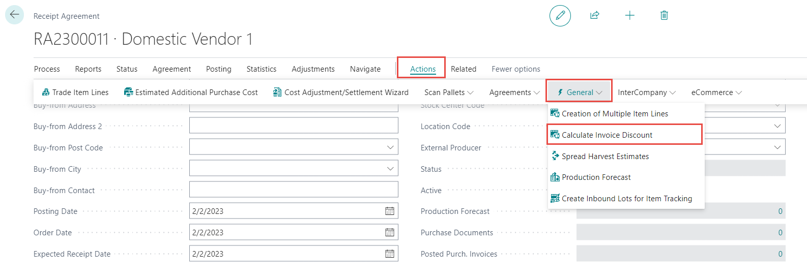 Once the agreement has received the status Released, click on Actions > General > Calculate Invoice Discount.