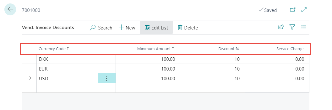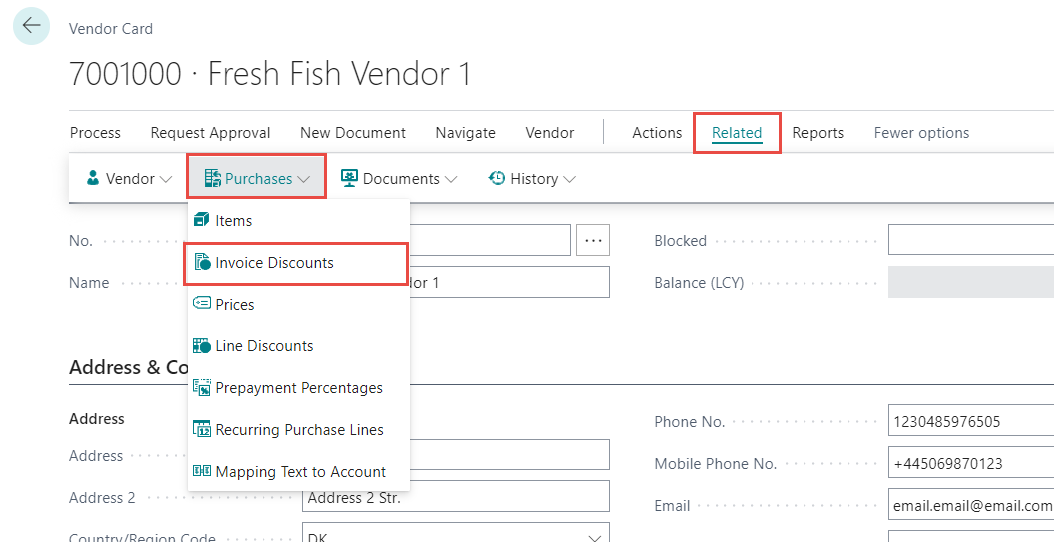 On the vendor card, click Related > Purchases > Invoice Discounts. This action sets up different discounts that are applied to invoices for the vendor. An invoice discount is automatically granted to the vendor when the total on a purchase invoice exceeds a certain amount.