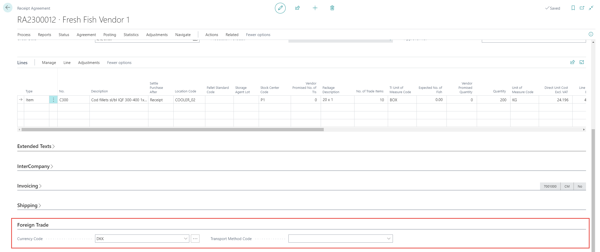 The system then retrieves the installed invoice discount from the vendor card based on which currency code is specified in the Foreign Trade tab in the Receipt Agreement.