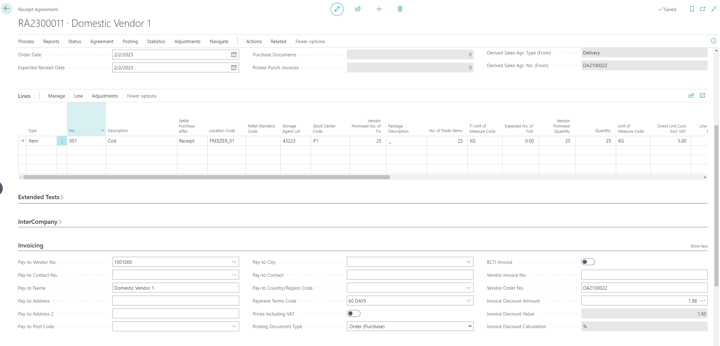 The discount can then be seen under the Invoicing tab on the Receipt Agreement. In that same tab the user is able to enter the amount of the discount in the field Invoice Discount Amount, however, the entered discount amount takes over the discount set up in the vendor card and becomes the amount given as a discount on this purchase. When that is done, the Invoice Discount Calculation changes from % to Amount. The field does not change back to %, even if the “correct” amount is entered. It is also not possible to change %, the invoice discount must be retrieved again with the Calculate Invoice Discount action in order for the value to become % again. If an amount has been entered in the Invoice Discount Amount field and the discount is then retrieved from the vendor card, then the entered amount is overwritten by the discount amount from the vendor card (even though the entered amount is still visible).