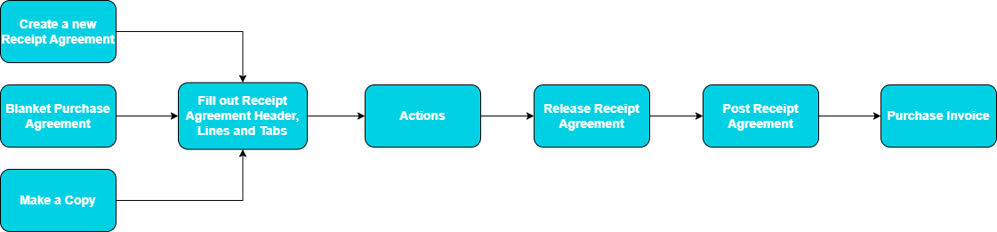 There are three ways to create a Receipt Agreement. A Receipt Agreement can be created from a Blanket Purchase Agreement. To view more details on how to do so, click here. In addition to that, it can be created by copying an existing agreement or by creating a new agreement (e.g., from the Receipt Agreement List).