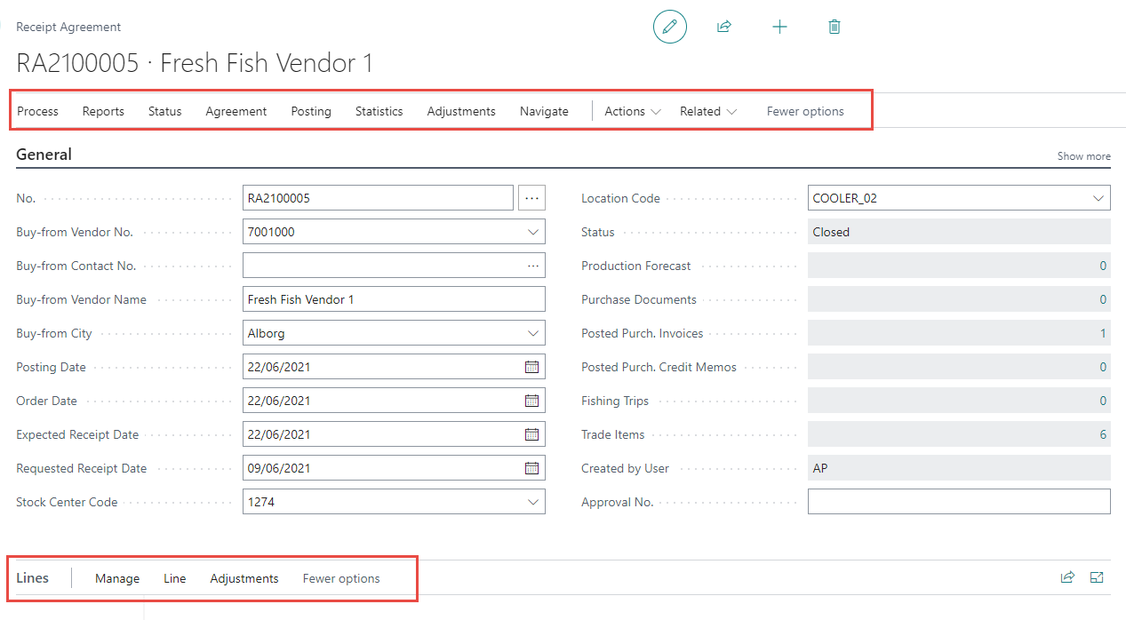 All Actions for Receipt Agreements are either located at the top ribbon or by lines.