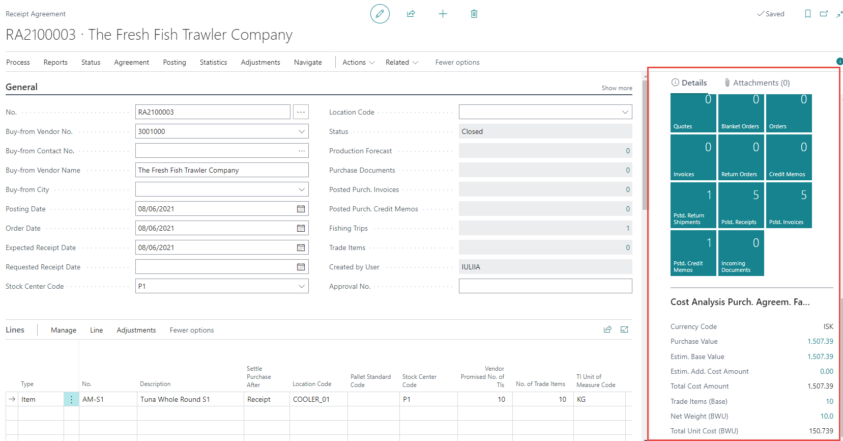 Information about the products that are being purchased are listed in the lines. The Receipt Agreement lines can have different statuses depending on the stage of the Purchase.