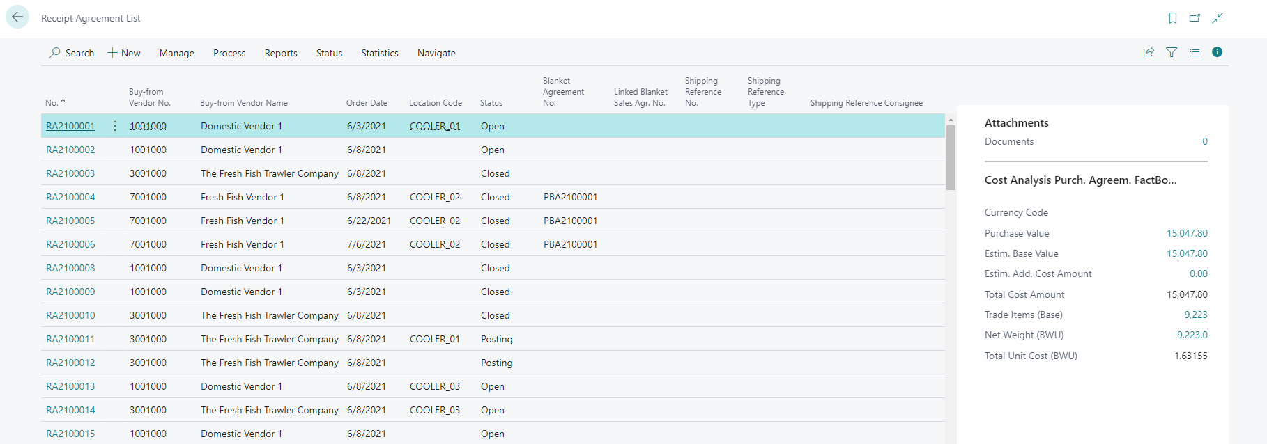 To view a list of all Receipt Agreements, use the Receipt Agreements List. The list contains all Receipt Agreements created in WiseFish and automatically sorts the Agreements by date, regardless of status (Open, Closed, Cancelled, Released). The list can be useful when looking up or filtering on certain Receipt Agreements.