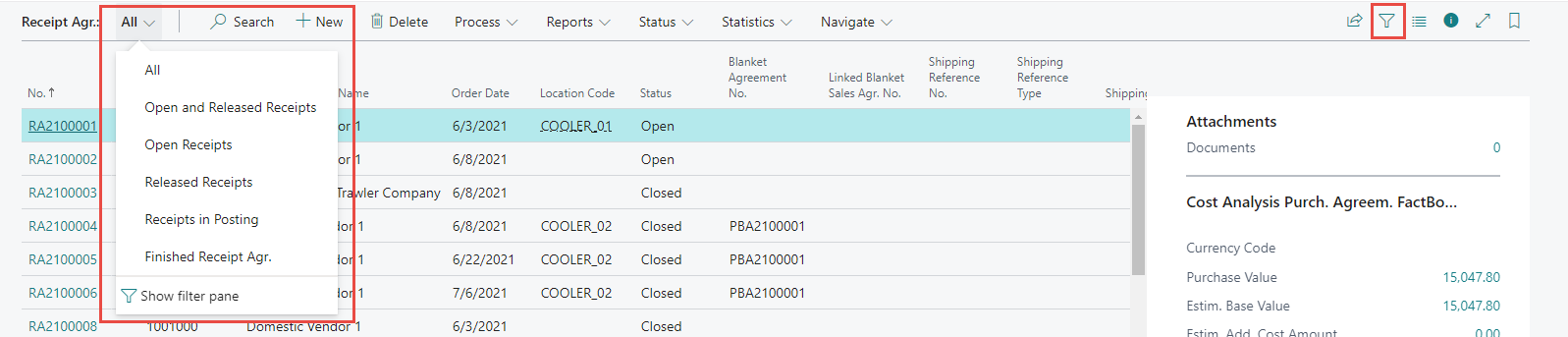 The Receipt Agreement List displays all Receipt Agreements without a filter.