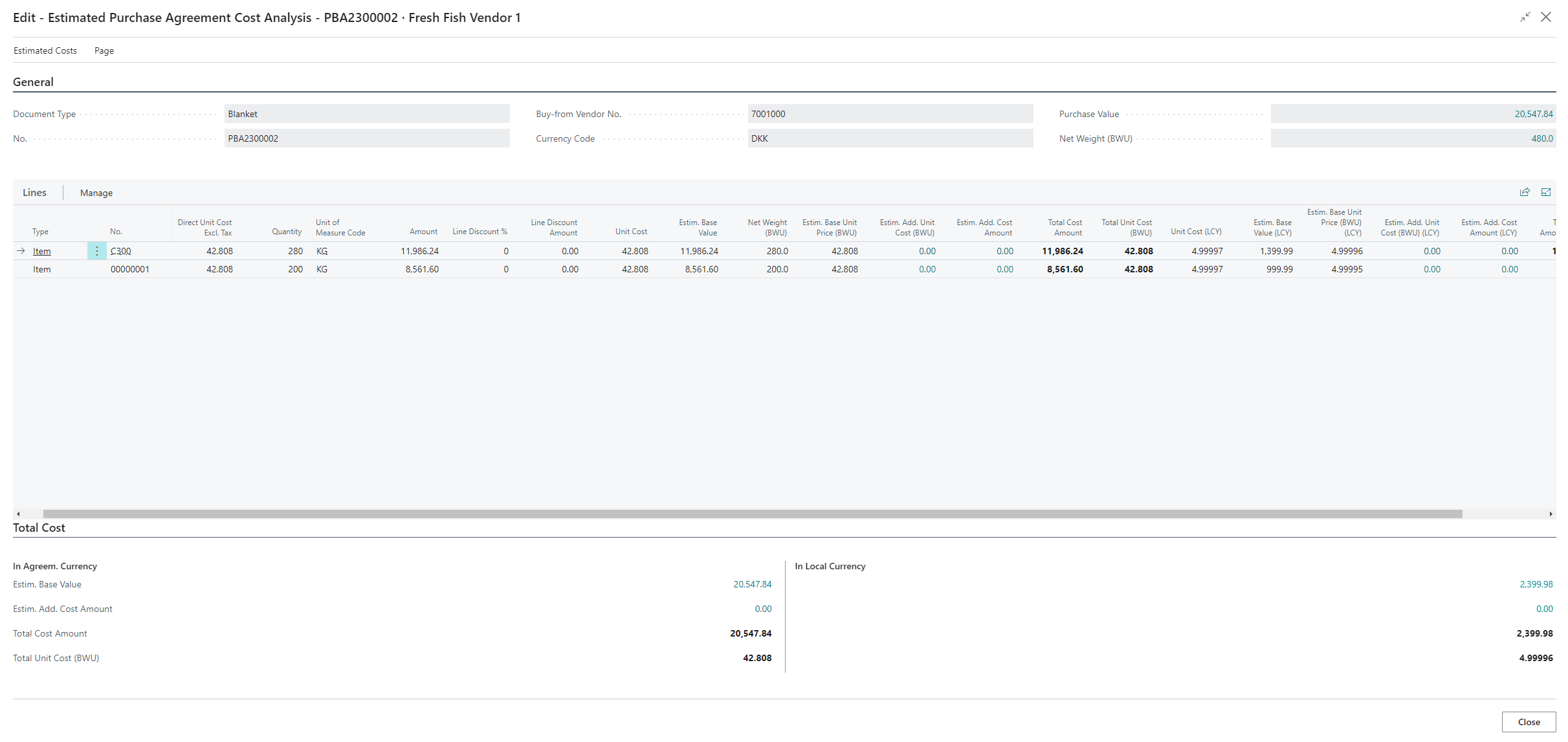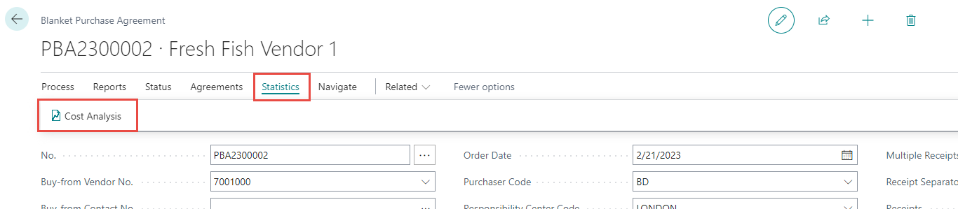 To view the cost analysis for the blanket purchase agreement, click Statistics > Cost Analysis in the ribbon.