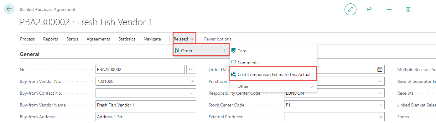 To view the cost comparison estimated vs. actual for the blanket purchase agreement click Related > Order > Cost Comparison Estimated vs Actual.