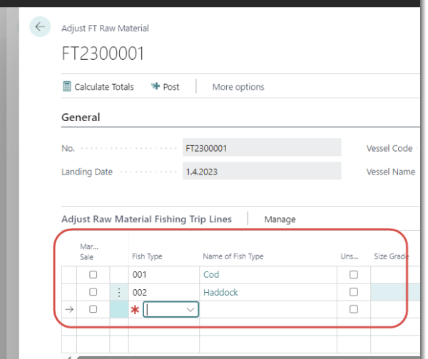 When selecting the item no while adjusting the raw material in landed fishing trip an error was displayed. The issue has been fixed so that user is able to select the Item No in adjust raw material line.