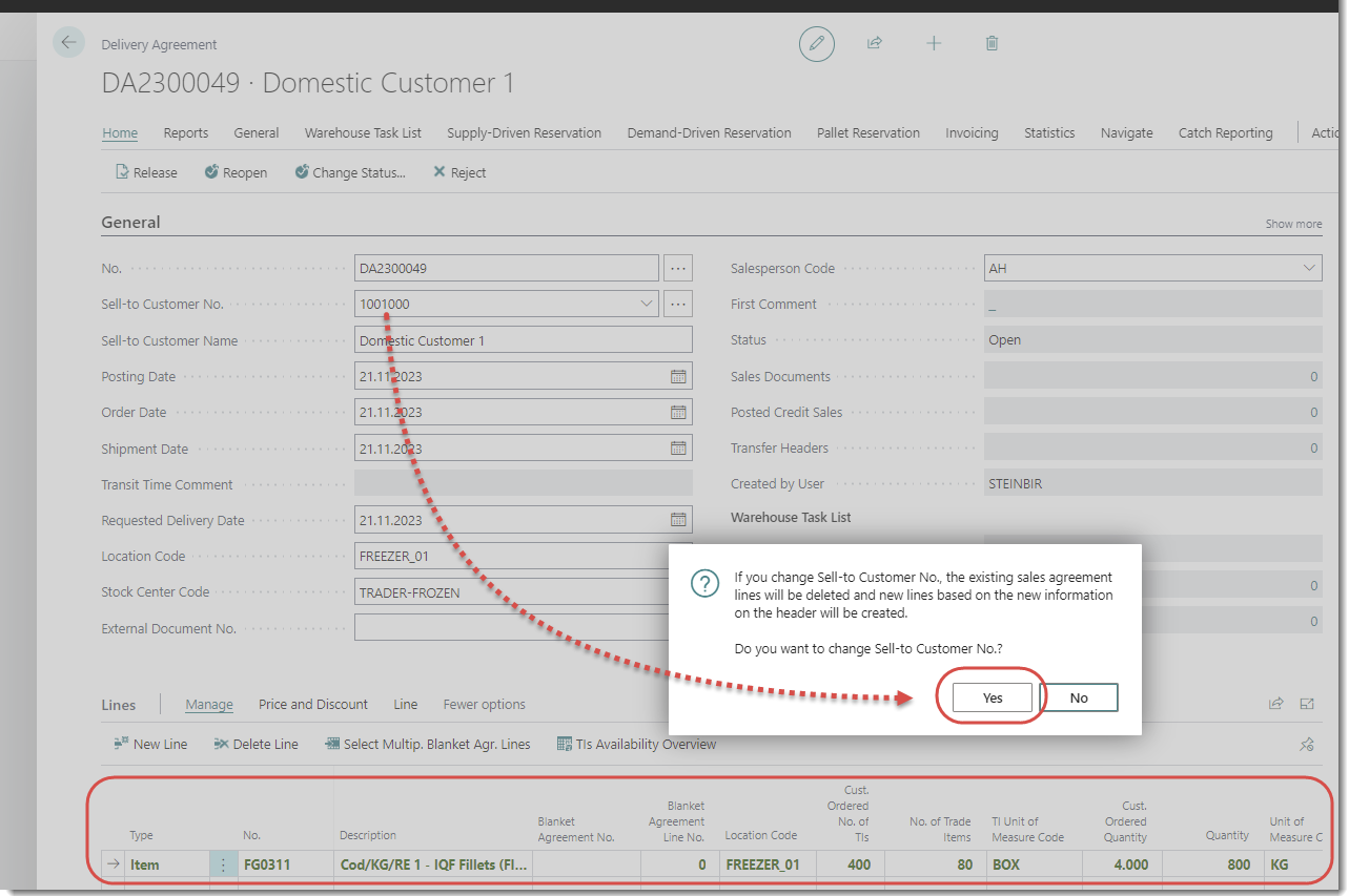 The user was not allowed to change the Sell to Customer in delivery agreement that has trade item reservation. The error has been fixed and the user is now able to change the sell-to customer in a delivery agreement containing trade item reservation. The user is displayed the warning message and when user agrees on the warning the Sell to Customer is changed.