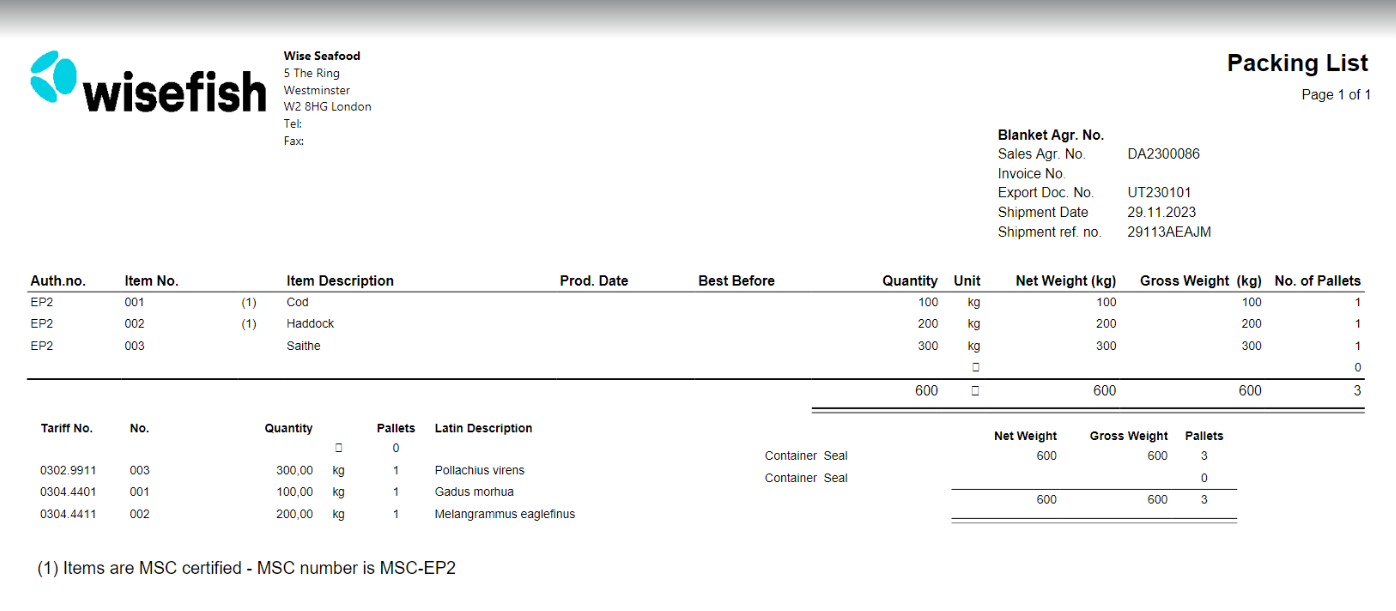 Catch certificate are broken down by weight for each tariff number