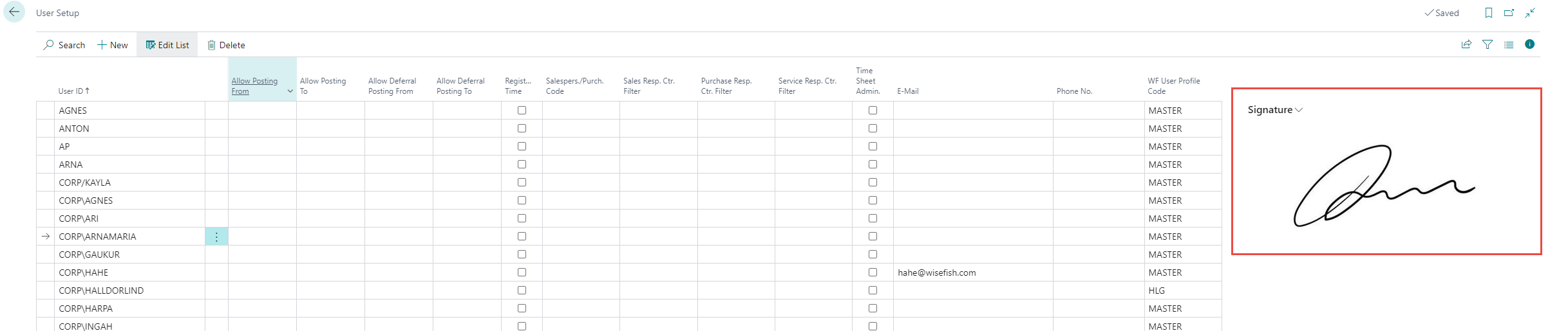 An enhancement has been done in the WF signature such that the signature in the WF User Profile has been made obsolete. After the enhancement If there is a signature on the WF User Profile, this signature will be pushed to all the users that are set up in the User Setup.