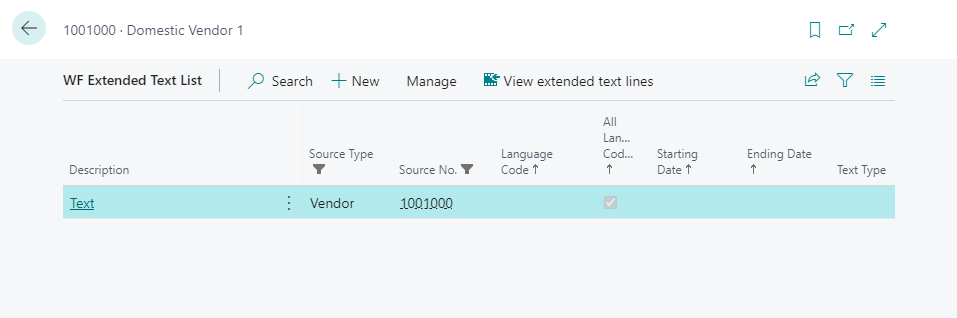 Same page opens as from the Extended Text List. Text that is added to items/customer/vendors will also be saved to the list. It is important to have the Description very clear and descriptive. Using the Text type is also useful.