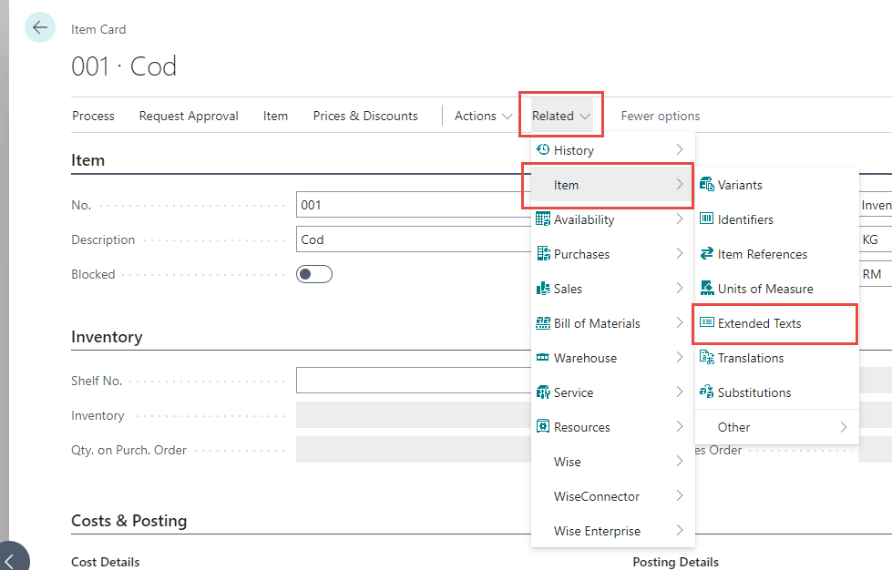 Go to the Item Card. Click Related > Item > Extended Text to add text to an item.