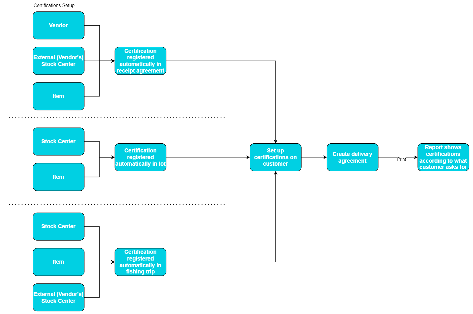 When purchasing items (raw materials, products) the user is able to indicate on the Vendor or External (Vendor's) Stock Centers whether they are certified. If there is a certification indicated on one of those, the certifications are automatically registered to the lines of the receipt agreement. If they are both in place on vendor and vendor stock center, the system will pick up the certifications on the vendor stock centers.