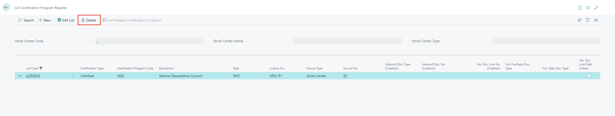 On the Certification Program subpage the user is able to select the line and click Delete.