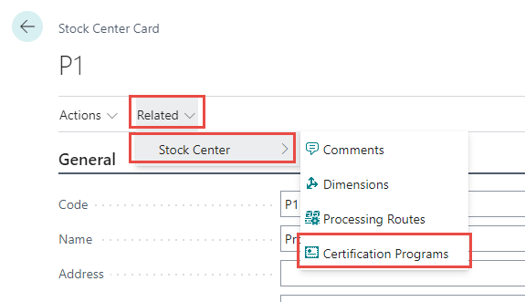 On the stock center card under the General tab there are certification related fields, Certification Process and Valid Certifications. These fields are vital to the setup. There are three options in the Certification Process field: