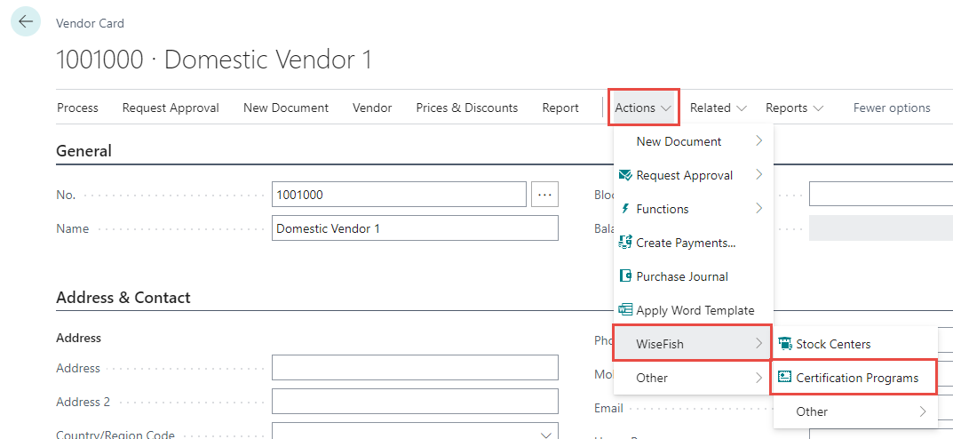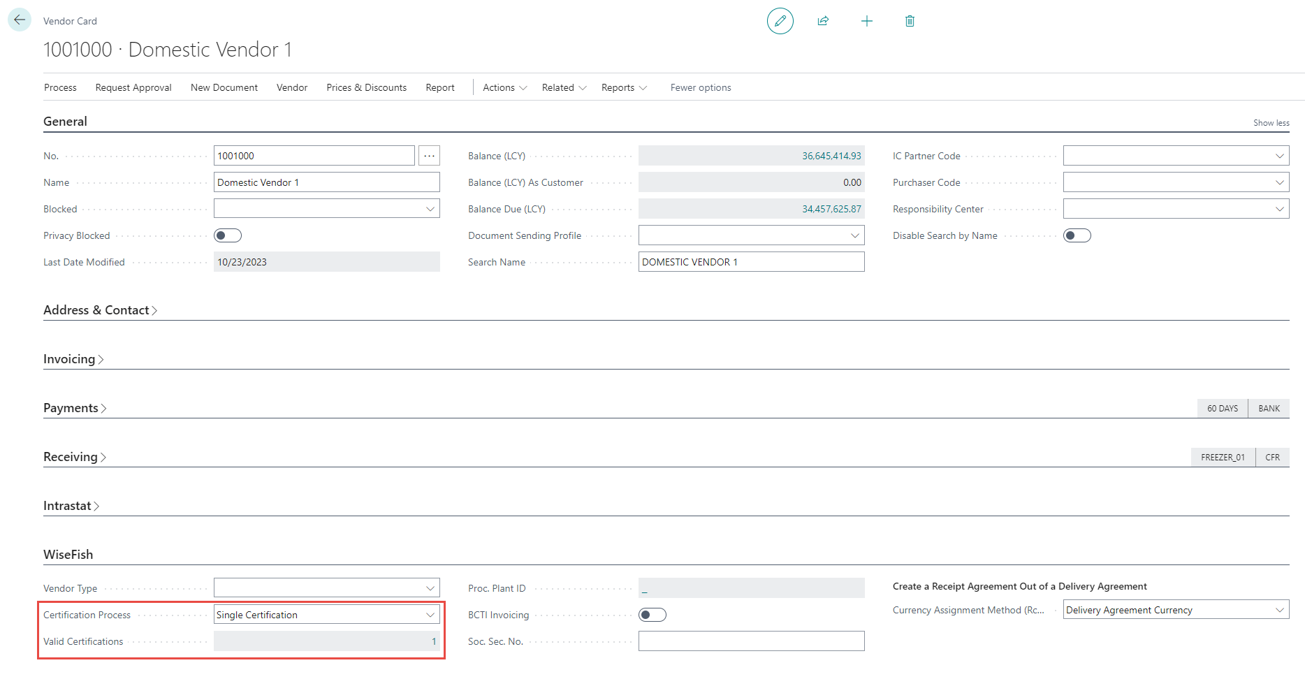 On the vendor card under the Wisefish tab there are two certification related fields, Certification Process and Valid Certifications. These fields are vital to the setup. There are four options in the Certification Process field: