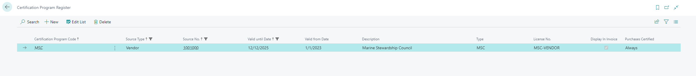 When purchasing certified raw materials or products from vendors the Certification Program Register can be recorded directly under the Vendor.
