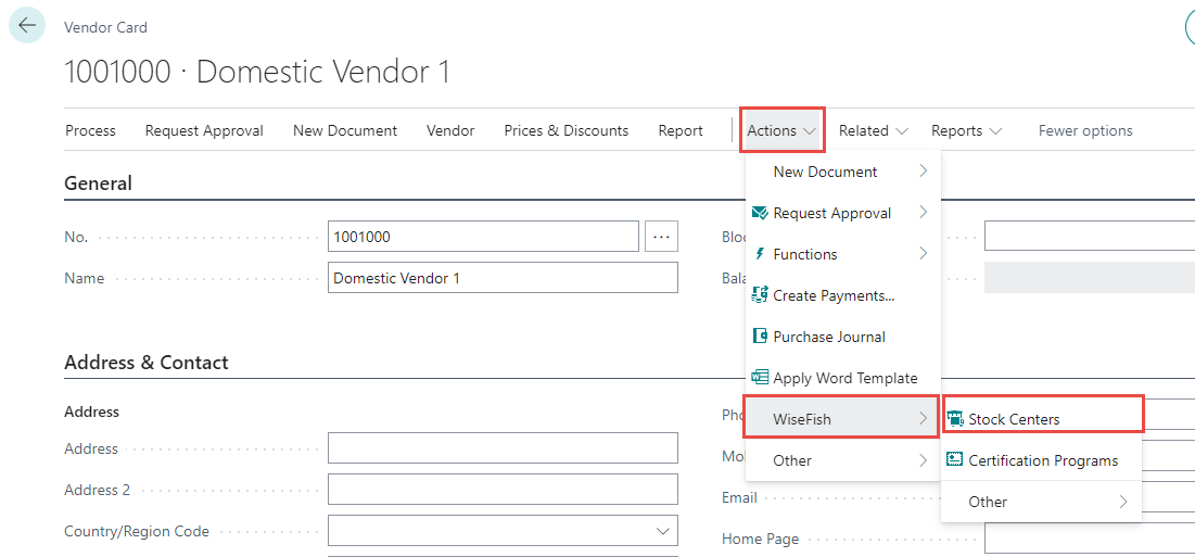 To open the Vendor’s Stock Centers click Actions > WiseFish > Stock Centers.