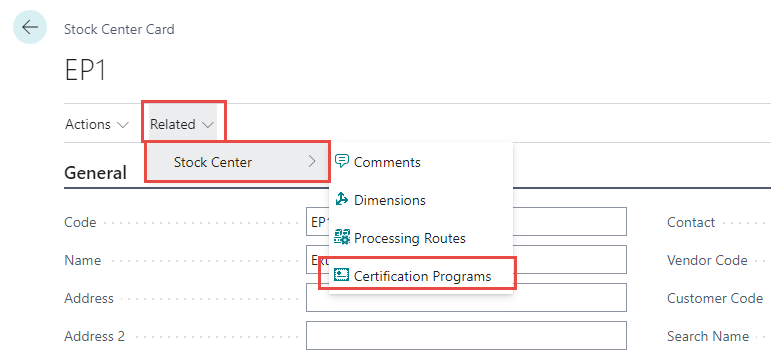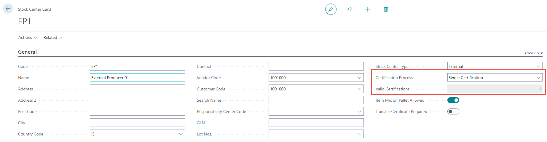 On the external stock center card under the General tab there are certification related fields, Certification Process and Valid Certifications. These fields are vital to the setup. There are three options in the Certification Process field: