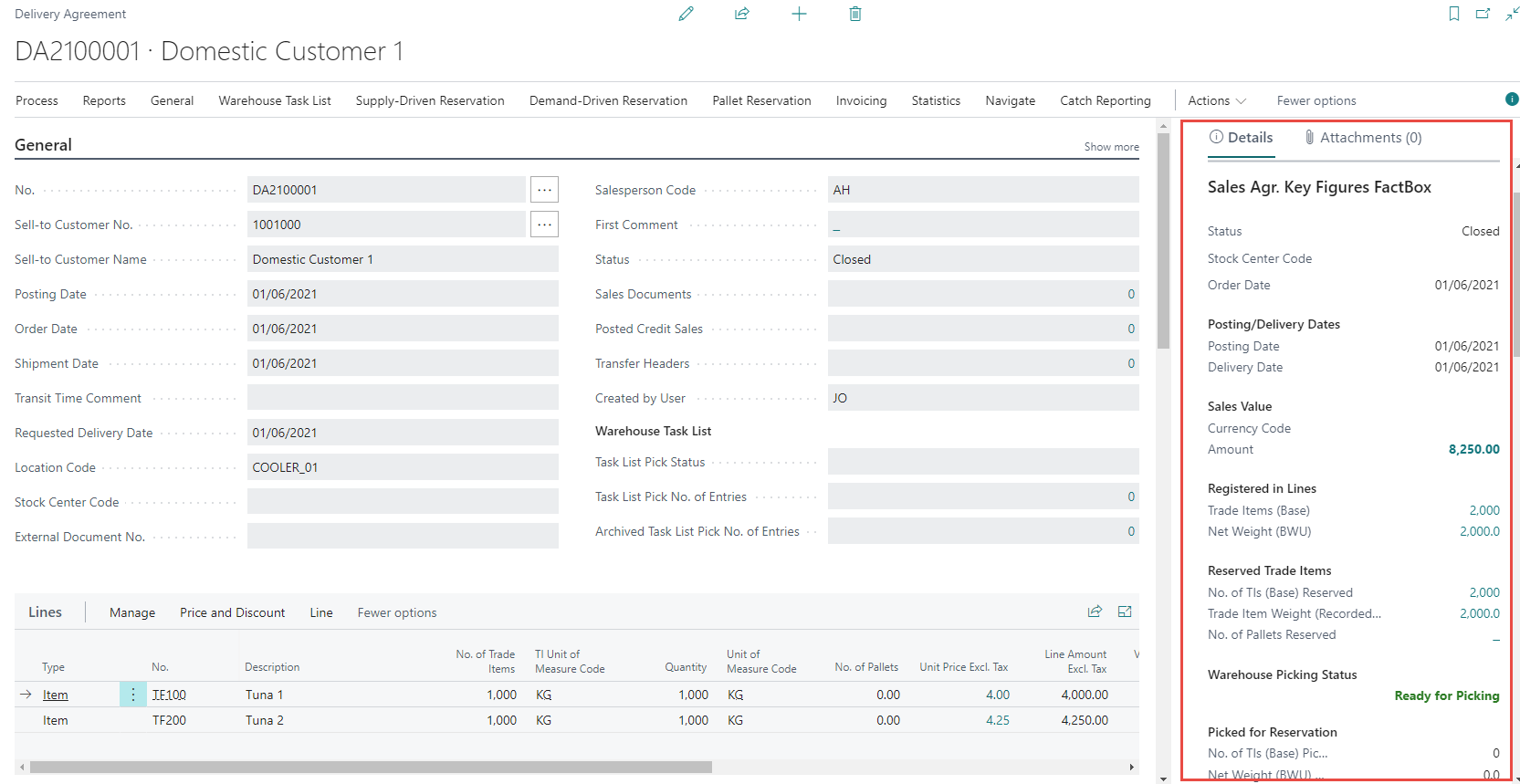 The Storage Receipt Agr. Key Figures Factbox contains the main and most important key figures for the agreement, for example totals number of trade items, total net weight etc.